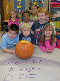 Students created a Jack-o-Lantern by designing a pumpkin with familiar shapes. They wanted me to incorporate a hexagon, octagon, pentagon and parallegram but I just could't accuratly cut the shapes out. Wow! I am impressed with how much they have learned.